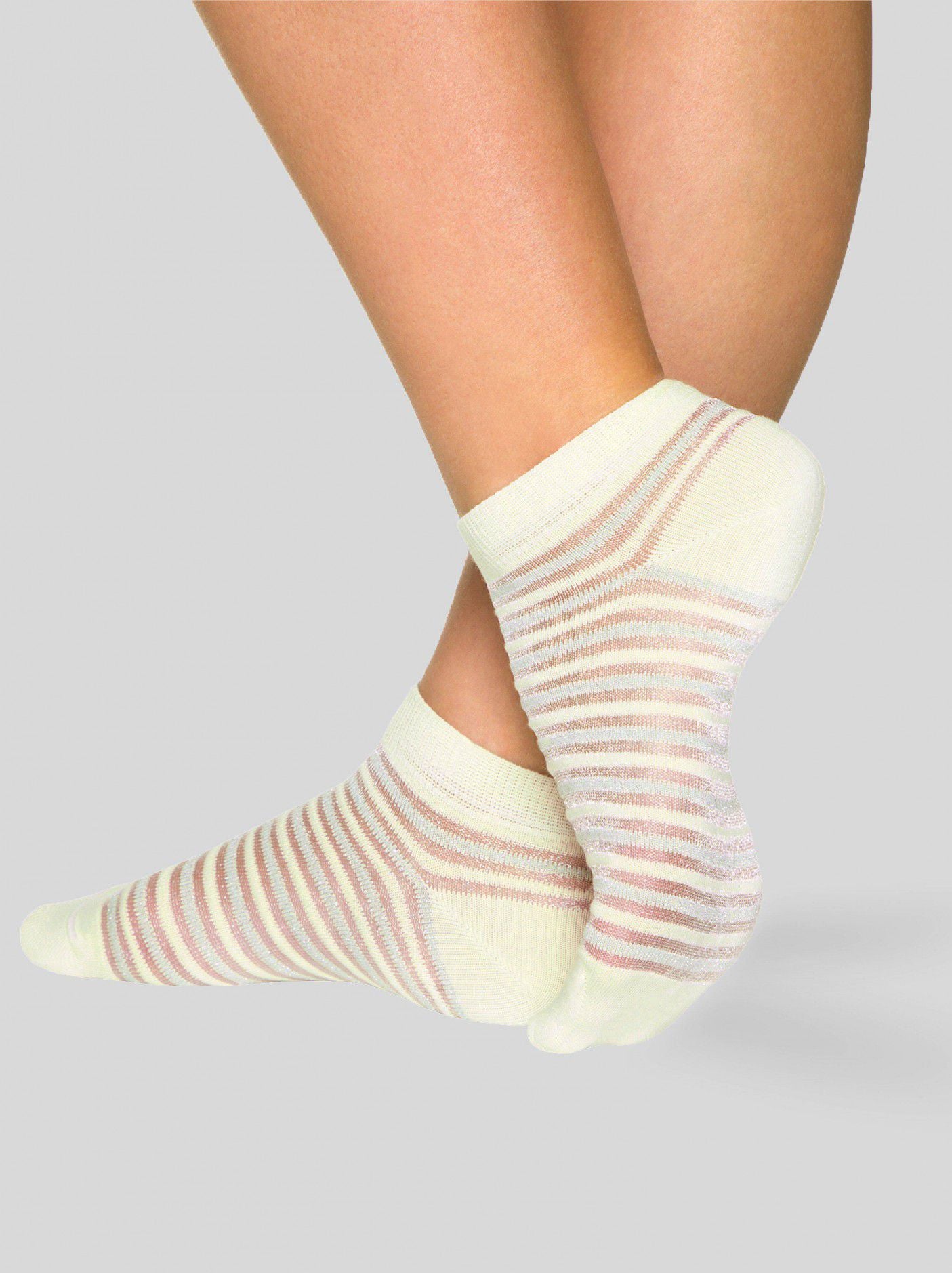 Фантазийные укороченные хлопковые носки со вставками из прозрачной сетки с люрексом идеально сидят на ноге. Тонкая двойная эластичная хлопковая резинка плотно прилегает к щиколотке, при этом не вызывает ни малейшего дискомфорта. Качественный хлопок и полиамид прост в уходе. Изделие немного тянется и современный материал из хлопка и безопасных синтетических добавок имеет приятную текстуру, пропускает воздух, поэтому ноги не будут потеть в обуви. Пятка и носок сделаны из хлопка для удобства в ношении. Тонкие и очень легкие носки будут отлично смотреться как с элегантной обувью, так и с кроссовками. Изделие предоставлено в 3 различных цветах.