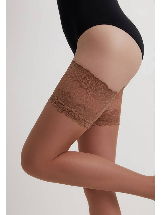 Show off your legs in these thin 20 denier fantasy stockings by Conte. The stockings have a wide 12 cm lace self-supporting elastic band with reinforced toe for comfort and hold. Made from a blend of polyamide and elastane, these high-rise stockings feature a solid black or bronze color. Hand wash only. Fits women's sizes X-Small to Small-Large.