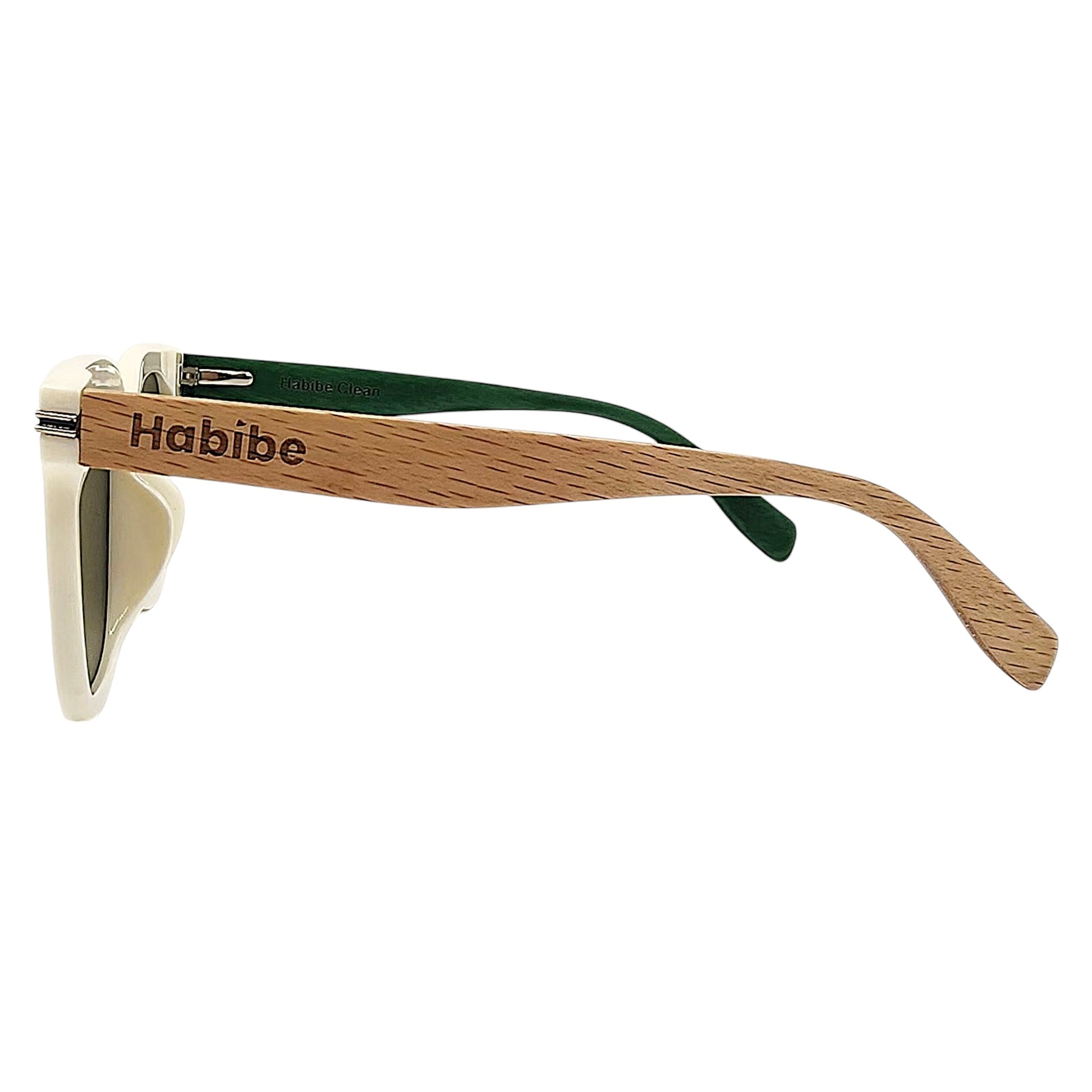 Premium oversized wayfarer frames with handcrafted spring hinge beechwood arms. Detail front and side accents on frame and signature Habibe logo on arms.