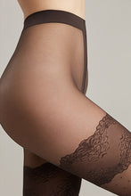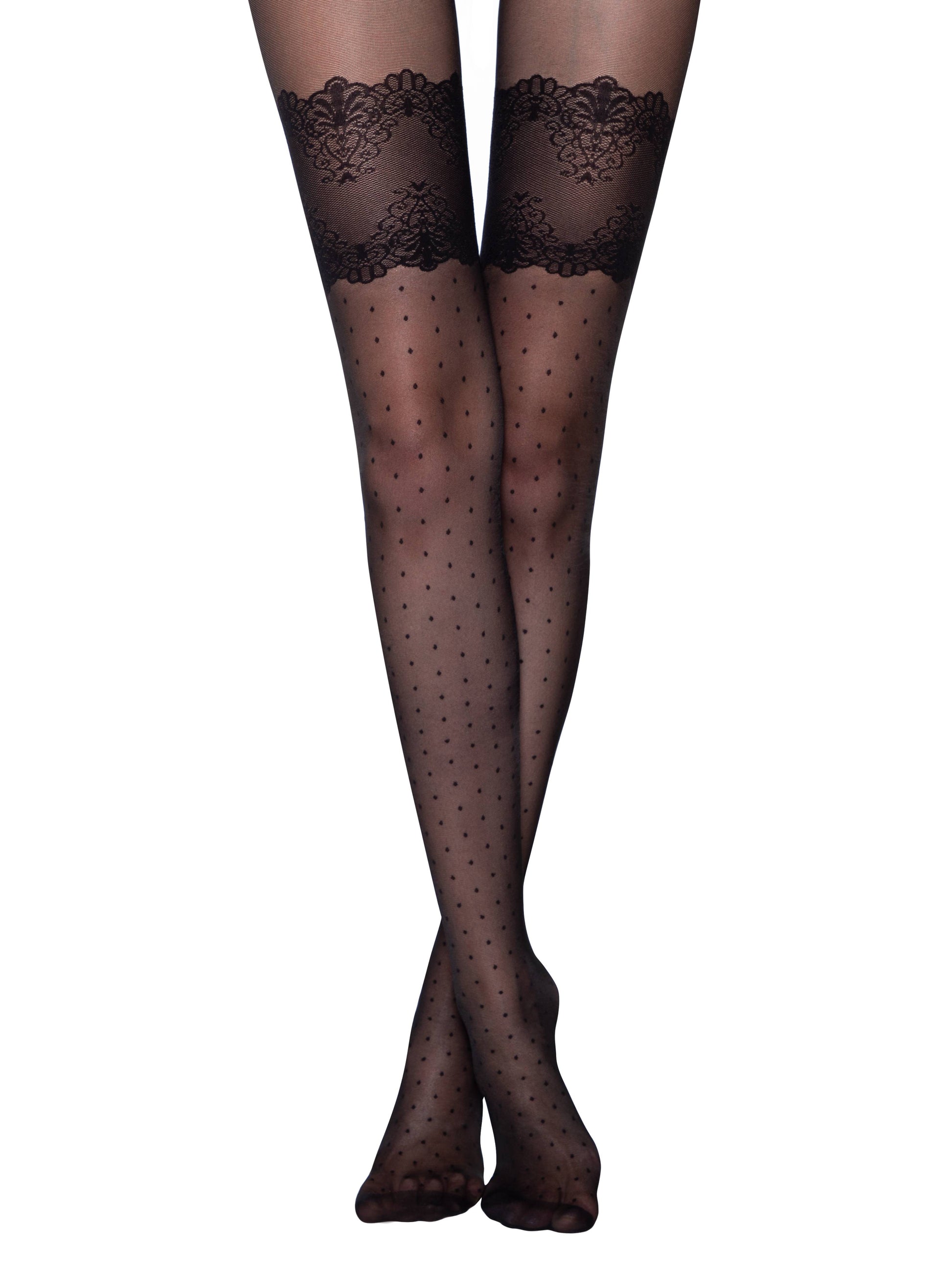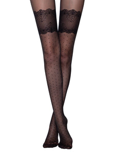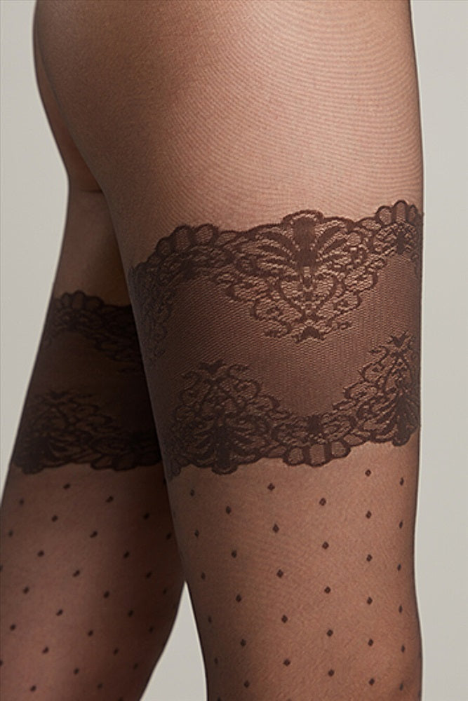 These elegant 20 denier tights feature a delicate pattern mimicking lace stockings with small polka dots. They offer a sheer, smooth, and silky finish with a classic waist fit and consistent texture throughout, without shorts. The 3 cm wide elastic band ensures secure wear, complemented by a hygienic cotton gusset and a comfortable flat seam. The transparent toe adds a refined touch, making these tights both stylish and practical.