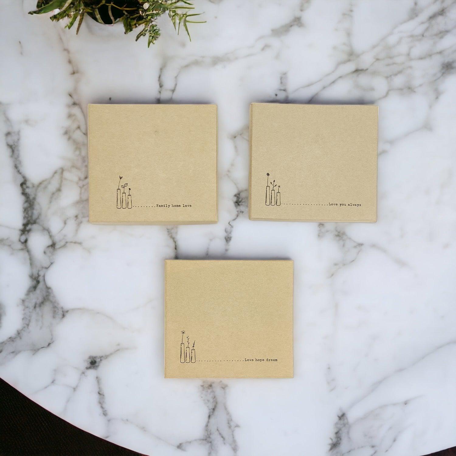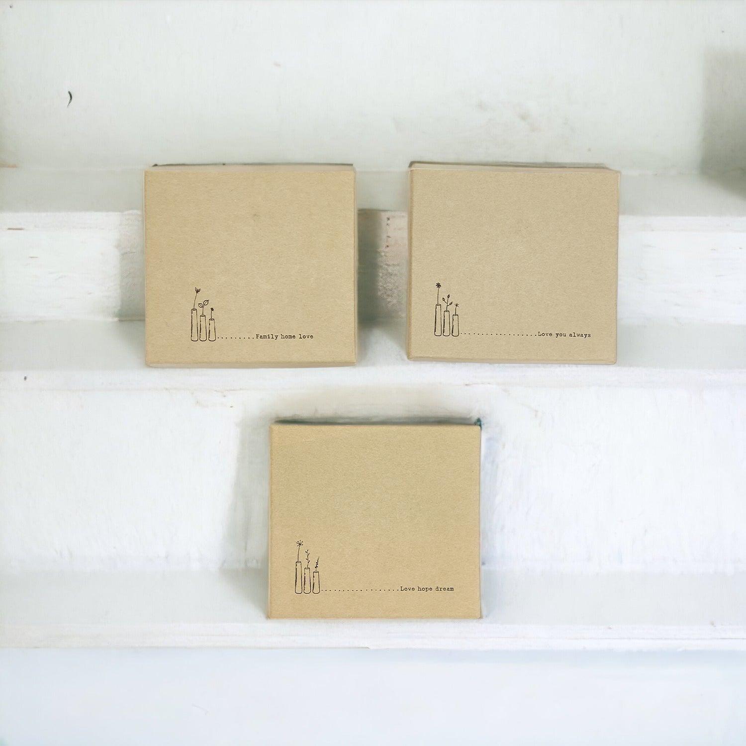 • Each set of 3 packed inside a box printed with a sweet saying on the front