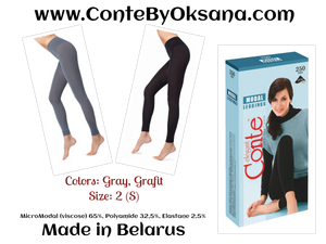 Conte Modal 250 Den leggings combine the softness and breathability of micromodal viscose with the stretch and durability of Lycra, creating a warm, thick, and opaque fabric ideal for cooler weather. The low-waist design with flat seams and a gusset ensures a comfortable fit without pressure points or irritation. The 3D construction provides a subtle shaping effect that gently contours the legs and hips for a flattering silhouette. These leggings are perfect for everyday wear, offering both comfort and light body modeling for a sleek, polished appearance.