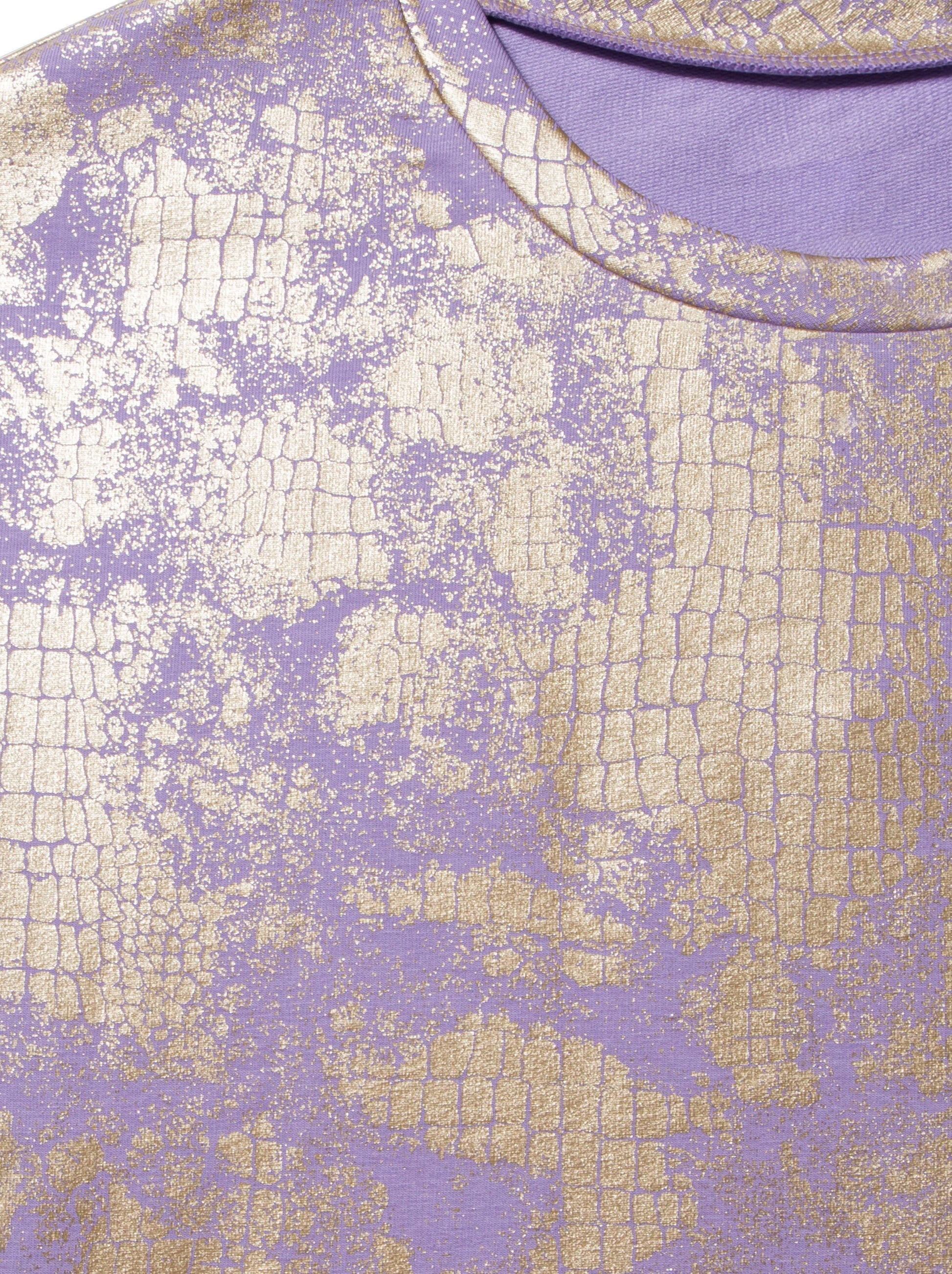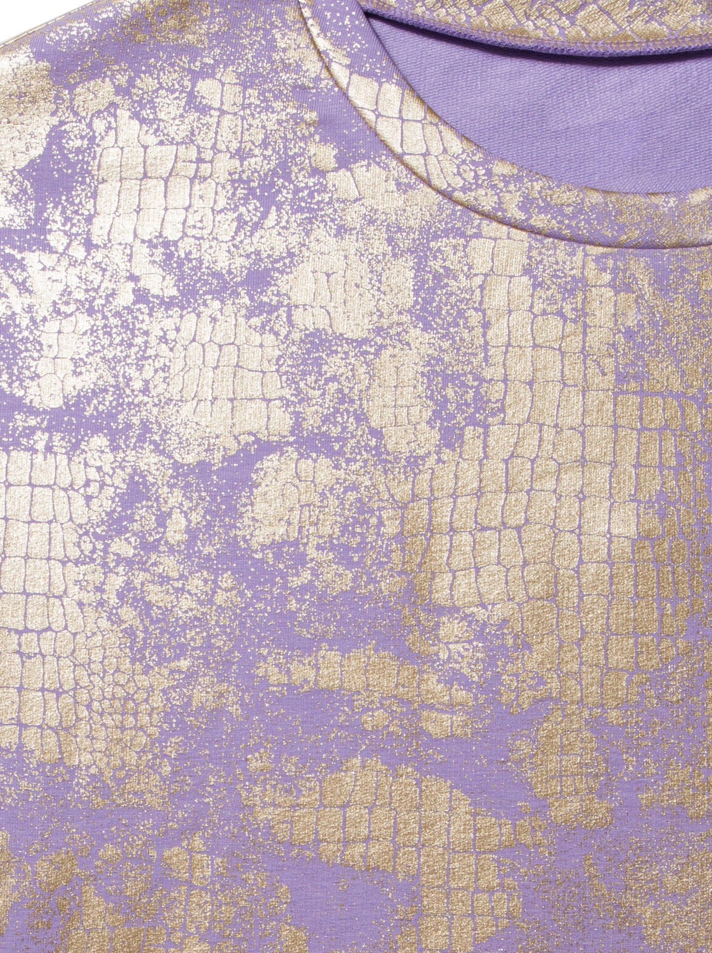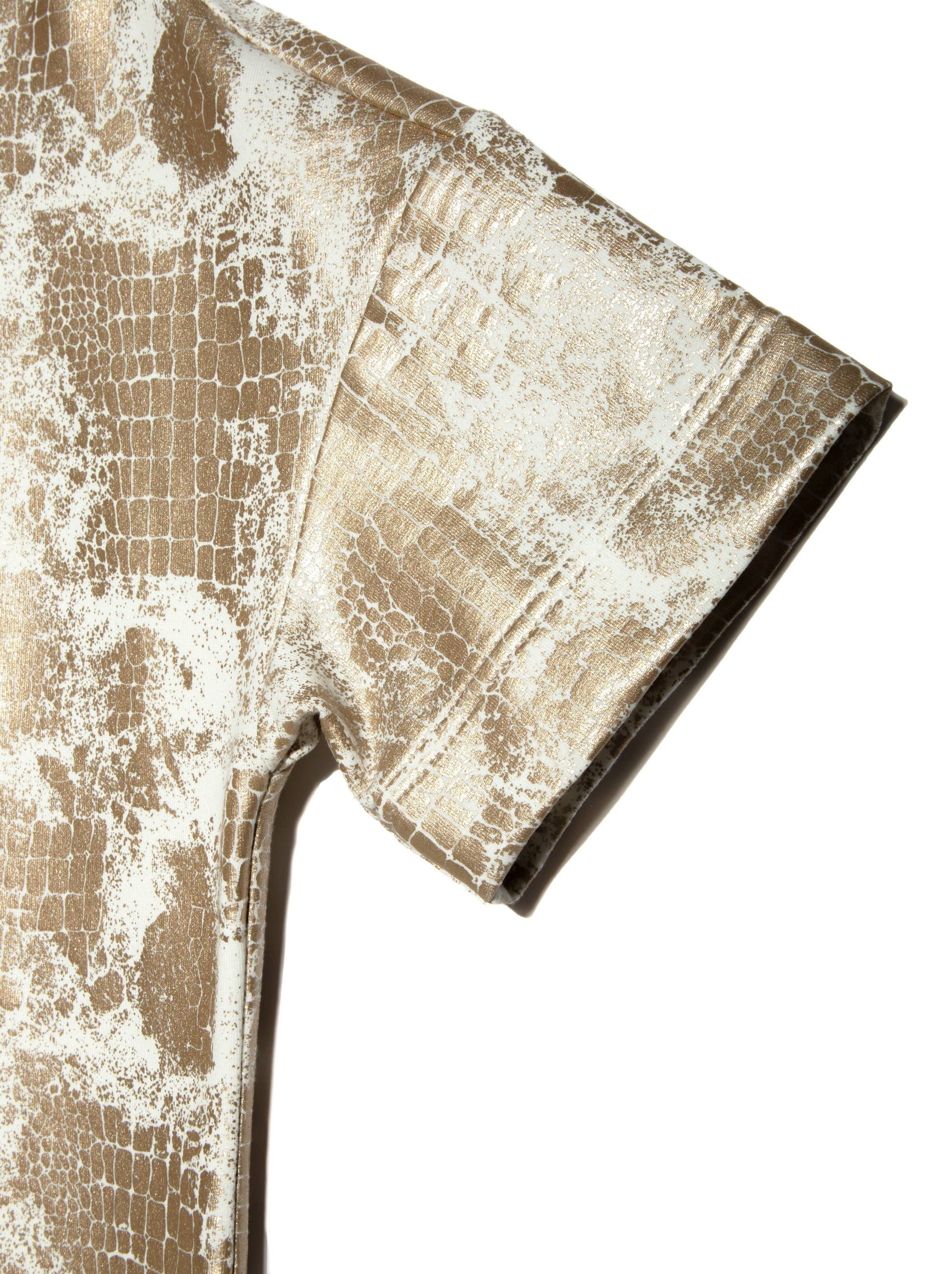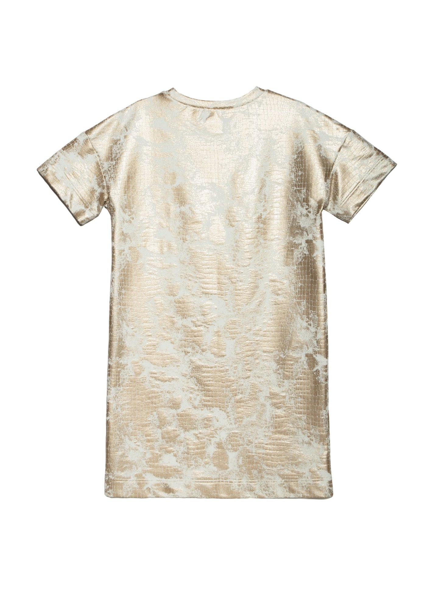 Сукня-туніка з еластичної бавовни з металевим принтом. Модний стиль оверсайз, м'який бавовняний трикотаж та вільний крій. Туніка м'яко облягає силует, не сковує рухів і водночас ідеально виглядає на будь-якій фігурі. Яскравий принт стійкий до численних прань та чудово зберігає яскравість кольору, якщо дотримуватися інструкцій з догляду. Додайте родзинку своєму повсякденному образу за допомогою сміливого золотого металевого принта.